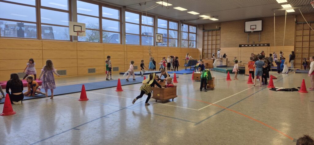 Schon beim Betreten der Halle war klar: Heute wird es bunt, laut und richtig spaßig! Zwischen Prinzessinnen, Superhelden, Tieren und fantasievollen Eigenkreationen leuchteten die unterschiedlichsten Kostüme um die Wette. Überall wurde gelacht, gehüpft und gestaunt. Die Turnhalle war kaum wiederzuerkennen – sie hatte sich in eine lebendige Spiel- und Tobewelt verwandelt, in der Bewegung, Musik und Gemeinschaft im Mittelpunkt standen.